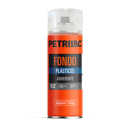 FONDO ADHERENTE PARA PLÁSTICOS es un fondo adherente, transparente e incoloro, que se utiliza como mano previa al pintado de plasticos en general para asegurar una correcta adhesión del esmalte a utilizar posteriormente. Si bien no todos los plásticos necesitan una mano previa de Adherente sugerimos siempre aplicarla. Apto para ABS, acrílicos, PVC, poliestireno, PET, y otros. No chorrea ni gotea. De uso exterior o interior.Los Aerosoles Petrilac tienen dos actuadores (picos) que presentan patrones de aplicación diferentes: uno permite aplicar la pintura más concentrada para superficies chicas o finas/angostas con un patrón circular; y el otro aplica la pintura más abierta con un patrón de dibujo más lineal ideal para superficies grandes (inserto rojo). Utilice el que más se adecue a su proyecto; pruebe cada actuador antes de iniciar el pintado de la pieza para ver cúal es el más adecuado.