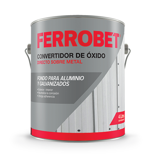 FONDO FERRO BET® convertidor para galvanizado y aluminio, está elaborado a base de resinas acrílicas modificadas de excelente adherencia, inhibidores y estabilizadores de óxido de la mejor calidad. Otorga gran adherencia en superficies difíciles, como galvanizados y aluminio. Sirve como base de cualquier pintura, ya sea al agua o al solvente. Puede usarse como terminación, aumentando el número de manos. Su acabado blanco satinado es muy decorativo, pudiendo lograr tonos pasteles con el agregado de entonadores universales, hasta 37,5 cm³ por litro. Muy fácil aplicación a pincel, rodillo o soplete.