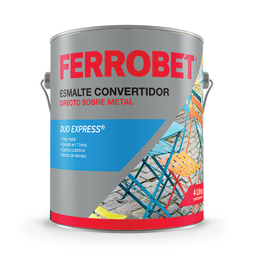 ESMALTE CONVERTIDOR DUO EXPRESS® es un esmalte acrílico 100 % directo sobre metal, de gran poder cubritivo, que no requiere de fondo y lo protege de la oxidación. La novedosa tecnología del "SECADO ULTRA RAPIDO" junto a su exclusivo sistema anticorrosivo permite terminar el trabajo de pintado en pocas horas; representando un importante ahorro de mano de obra, tiempo y dinero. Es TODO METAL, lo que significa que es apto para pintar sobre hierro, acero, galvanizado, aluminio, zinc, etc. Brinda una película de notable dureza y superior resistencia a lluvia ácida, ambientes salinos, rayos UV y agentes cáusticos, manteniendo su adherencia sin producir ampollado, cuarteado o descascarado. No amarillea, como en el caso de los esmaltes sintéticos. ESMALTE CONVERTIDOR DUO EXPRESS® permanece inalterable por mucho más tiempo, con una decoración de superlativo brillo en colores vivos.